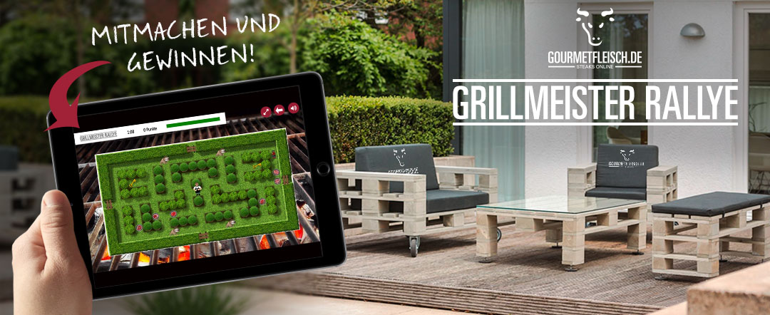 Zum Start in die Europameisterschaft starten wir eine GRILLMEISTER RALLYE. Beweisen Sie sich als echter GOURMETFLEISCH-Grillmeister und machen Sie bei unserer Grillmeister Rallye mit. Sammeln Sie schnellstmöglich alle Gourmetsteaks ein. Weichen Sie erfolgreich den aggressiven Hunden aus, denn diese rauben ihnen Energie. Mit der Gourmetfleisch-Steaksauce können Sie ihre Energie aber wieder auffrischen. Die Zeit ist aber begrenzt! Die Uhr läuft und die Steaks müssen eingesammelt werden bevor sie auf den Grills verbrutzeln! Ein guter Grillmeister lässt seine Gäste natürlich nicht warten, nutzen Sie die goldenen Schlüssel um neue Wege zu finden um schneller ans Ziel zu gelangen. Alle Grillmeister die unsere Rallye erfolgreich abschließen und das Kontaktformular vollständig ausfüllen nehmen automatisch am großen Gewinnspiel teil.